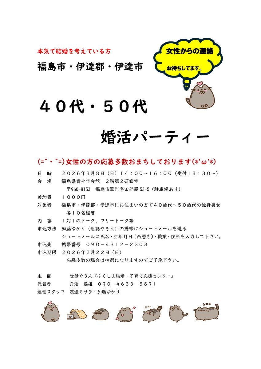 福島市・伊達郡・伊達市のお住まいの方で40歳代~50歳代の独身男女
